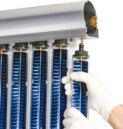 Heatpipes vangen de energie van de zon op en slaan deze als warmte op in een groot vat: de zonneboiler.
